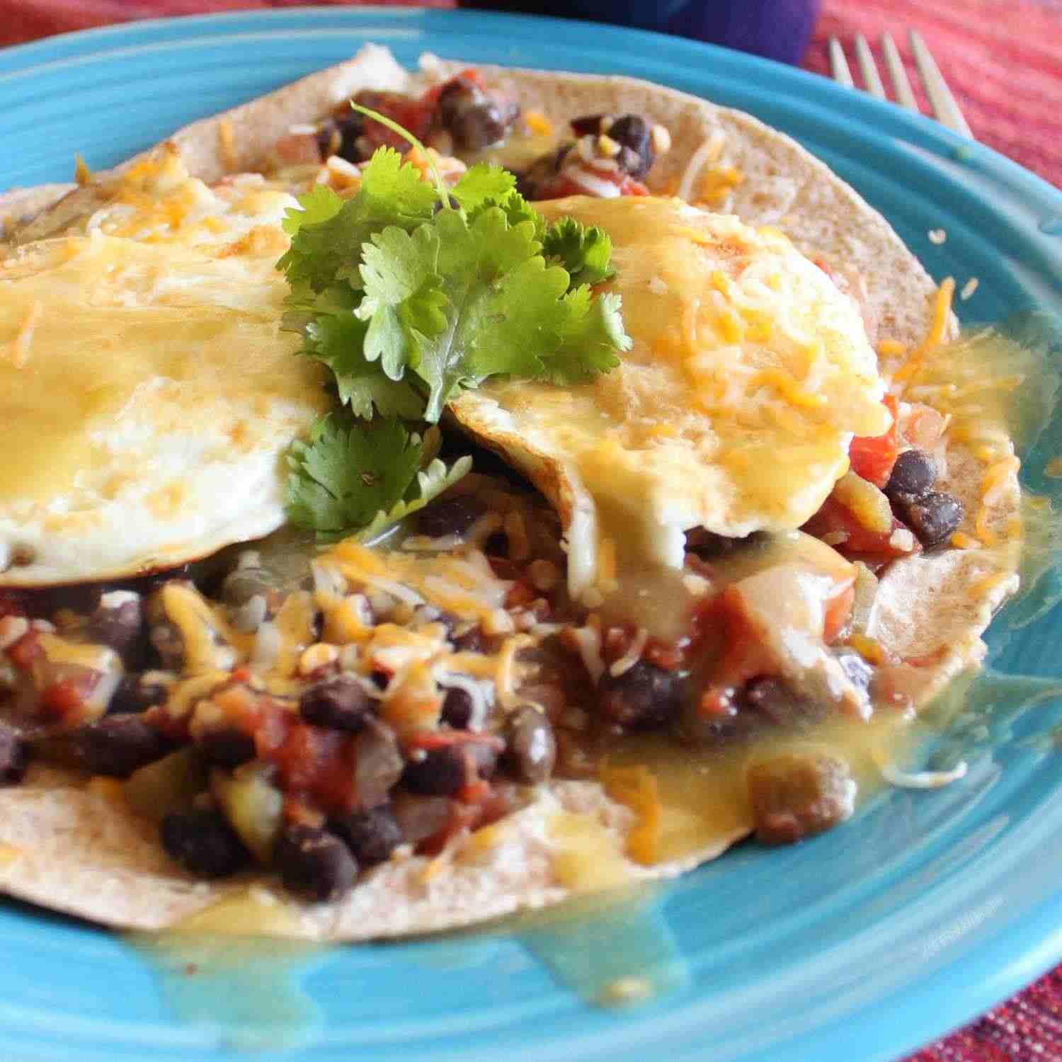 - Step 7:To assemble huevos rancheros: Place cheese-filled tortillas on four serving plates. Top each tortilla with black bean mixture, a layer of salsa, and an egg. Serve immediately.