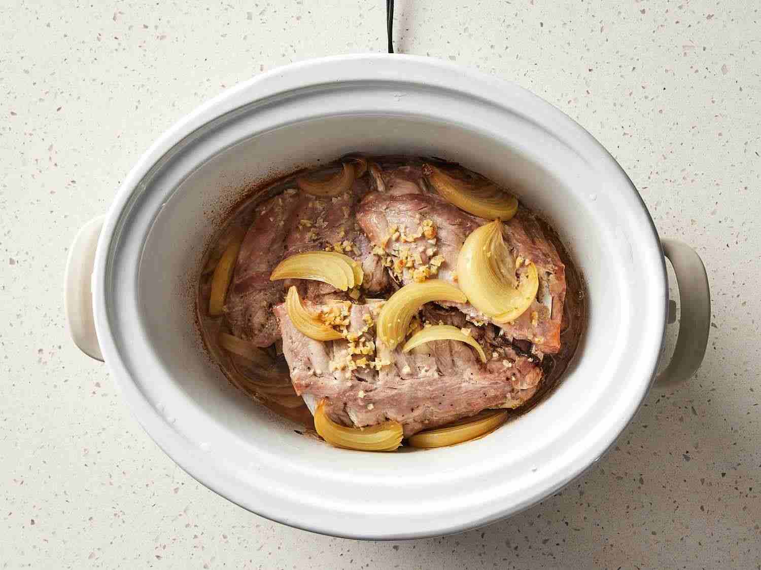 - Step 5:Transfer ribs from the slow cooker to a baking sheet; discard onion and garlic. Coat ribs with barbeque sauce. Dotdash Meredith Food Studios